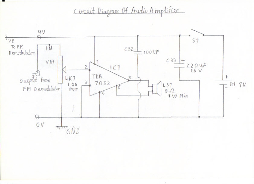 Please refer to pictures 1 and 2 for construction details of the audio amplifier. It is based on the popular TDA7052 series of audio ICs and requires only a couple of decoupling components and a volume control to get it working. It is also a lot more stable then the LM386 used in my single conversion design and is capable of about 1 Watts of audio power. Also because of its stability, the receiver can also be powered off the same 9V battery supply, saving you the cost in batteries. Picture 2 is the wiring diagram and layout for this amplifier and can be constructed on plain Vero board. Please insure that you follow the diagram very carefully regarding the component orientation. Pay particular attention to C32 the electrolytic capacitor, ensuring that the lead marked with the +Plus sign corresponds as shown in the wiring diagram. IC 1 must be mounted into a 8 pin IC socket rather then soldering it to the board and when inserting this component please make sure that the half moon shaped mould at the top of this component corresponds with pins 1 and 8 as shown in the wiring diagram. Also the leads marked in red pencil relating to the wiring diagram route underneath the circuit board. The leads marked in black pencil are link wires and must route over the top of the circuit board. The same also applies to all circuits that follow this stage. If you have wired this stage and are confidently sure you have checked the wiring and polarity of components carefully you may now proceed with testing. Start by connecting a speaker to pins 5 and 8 preferably one with not less then 1 Watts handling power. NB Smaller speakers such as the 250 milliwatt type used in miniature radios are not recommended for this amplifier. Advance the volume control VR1 fully clockwise. Connect a battery supply of 9 Volts observing the correct polarity. You will find there is no switch on clicks or soft hissing when first connecting this amplifier compared to the LM386. If you touch the Input terminal marked L on the volume control, you should hear a humming noise which means this stage is working correctly. If this is so, switch off and remove the batteries. Please refer to step 5 for construction of the FM Demodulator.